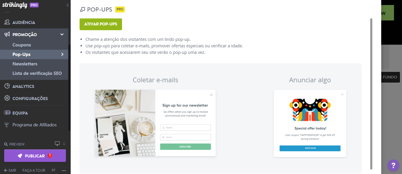 - Blogs maduros têm que ficar marcados na memória de seus leitores, para que da próxima vez que eles quiserem alguma informação sobre o seu nicho, eles naturalmente se voltem para o seu website. Uma maneira de conseguir isso é coletando endereços de e-mail de usuários que visitam sua página da Web e enviando e-mails regulares. Certifique-se de não bombardear seus visitantes com muitos e-mails. Um e-mail em uma semana seria a frequência perfeita para se manter atualizado nas memórias de seus clientes sem parecer tão desesperado. Você pode coletar o e-mail do seu público usando o recurso pop-up avançado oferecido pelo Strikingly.